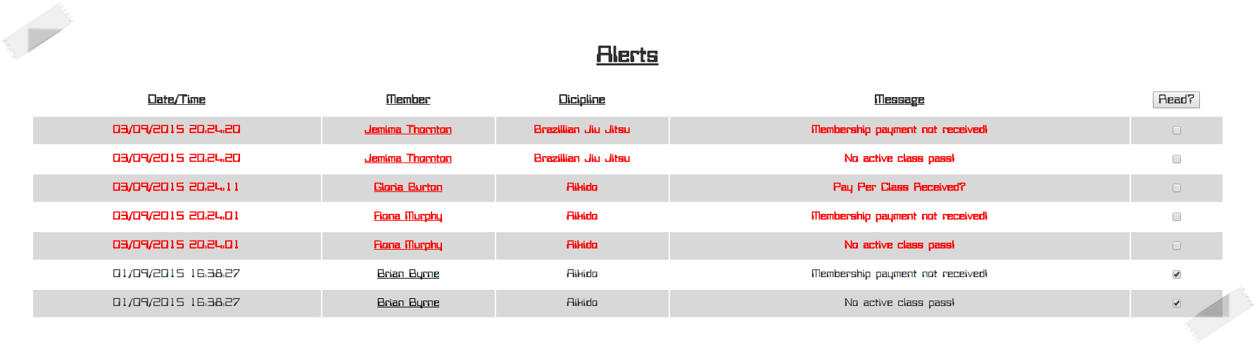 | Alerts are shown when a member signs in for class and they have overdue fees. |